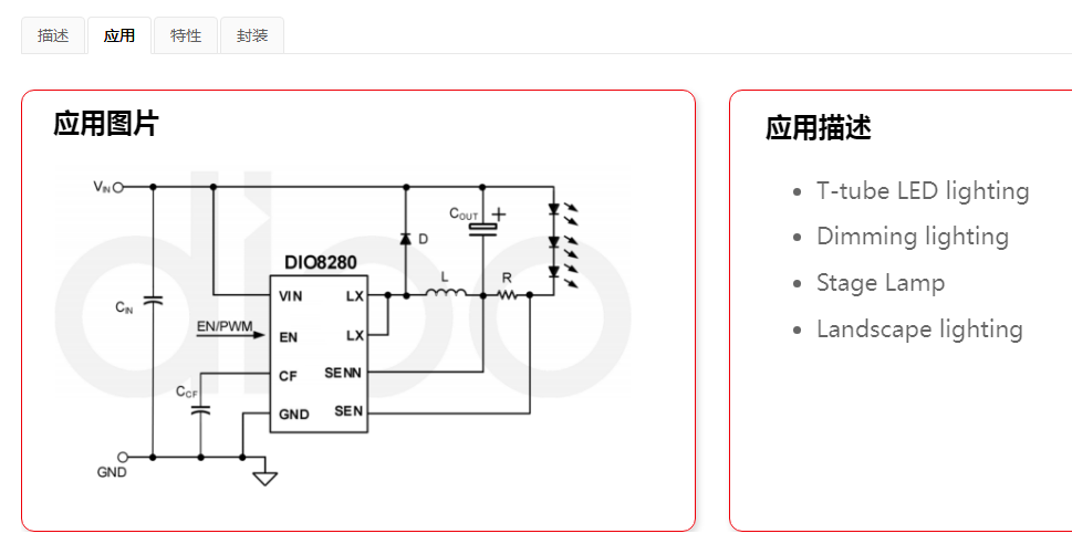 The DIO8280 consists of an integrated grounding Buck Regulator and 85V power MOSFET, specifically designed for a high performance non-isolated converter with minimal external components targeting at LED lighting applications. The DIO8280 drives the Buck converter with ultra-low RDS(ON) power switch to achieve higher efficiency and keeps the Buck converter connecting PWM signal with EN pin or connecting Analog signal with CF pin to achieve dimming control.