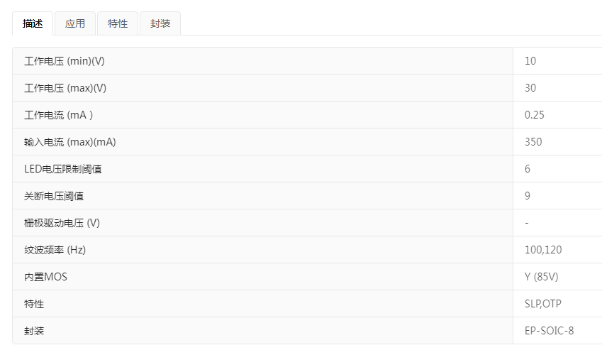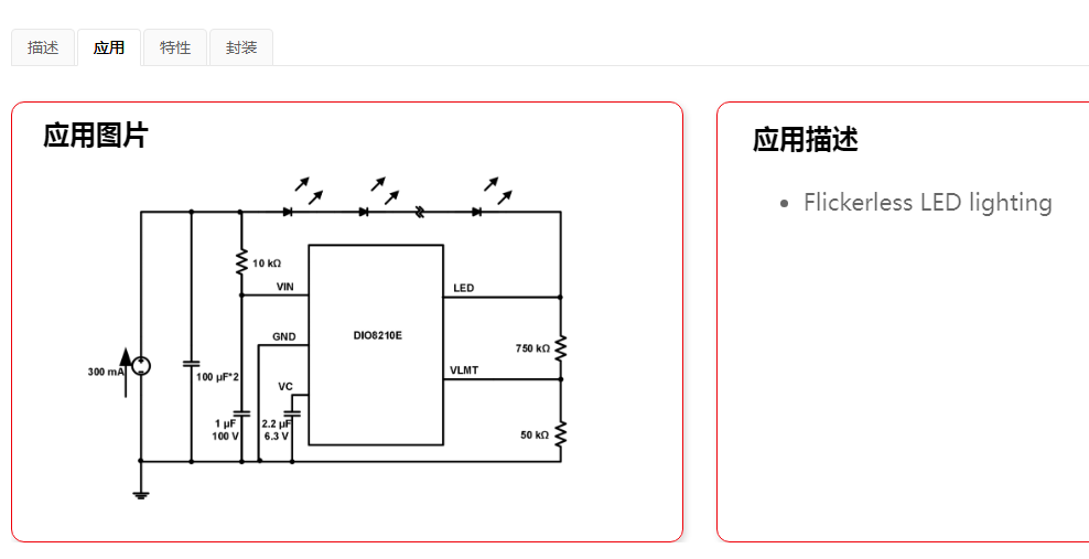 DIO8210E is used to drive a LED string, and remove the 100/120 Hz current ripple on AC/DC power by a capacitor between VC and GND. If the voltage on LED pin exceeds 6 V, the current ripple removing function is disabled, which could help limit the power dissipation on chip. DIO8210E provides short protection, open protection and HOT-PLUG protection. The maximum LED current is internally limited at 0.5 A. DIO8210E provides over thermal protection. When the OTP is trigged, the function of current ripple removing is shielded and MOSFET is ON until VIN restart.