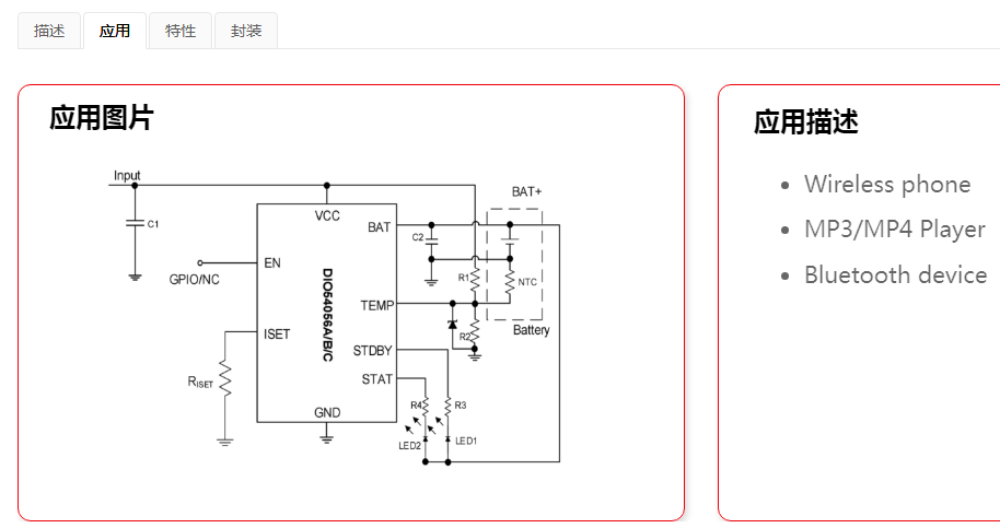 The DIO54056A is a complete constant-current / constant voltage linear charger for single cell Lithium-Ion batteries. No external sense resistor is needed, and no blocking diode is required due to the internal MOSFET architecture. The charge voltage is fixed at 4.4V for DIO54056A, and the charge current can be programmed externally with a single resistor. The DIO54056A automatically terminates the charge cycle when the charge current drops to 1/10 the programmed value after the final float voltage is reached. When the input supply (wall adapter or USB supply) is removed, the DIO54056A automatically enters a low current state, dropping the battery drain current to less than 0.5µA. The DIO54056A can be put into shutdown mode, reducing supply current to 42µA (Typ.). DIO54056A is available in DFN2*2-8 package.