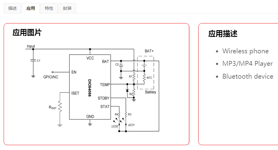 The DIO54056 is a complete constant-current / constant voltage linear charger for single cell Lithium-Ion batteries. No external sense resistor is needed, and no blocking diode is required due to the internal MOSFET architecture. The charge voltage is fixed at 4.2V, and the charge current can be programmed externally with a single resistor. The DIO54056 automatically terminates the charge cycle when the charge current drops to 1/10 the programmed value after the final float voltage is reached. When the input supply (wall adapter or USB supply) is removed, the DIO54056 automatically enters a low current state, dropping the battery drain current to less than 0.5µA. The DIO54056 can be put into shutdown mode, reducing supply current to 42µA (Typ.). DIO54056 is available in DFN2*2-8 and EP-SOIC8 packages.