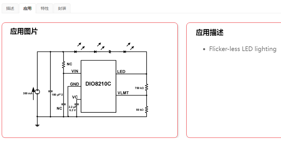 DIO8210C is used to drive a LED string, and remove the 100/120 Hz current ripple on AC/DC power by a capacitor between VC and GND. If the voltage on LED pin exceeds 6 V, the current ripple removing function is disabled, which could help limit the power dissipation on chip. DIO8210C provides short protection, open protection and HOT-PLUG protection. The maximum LED current is internally limited at 0.5 A. DIO8210C provides over thermal protection. When the OTP is trigged, the function of current ripple removing is shielded and MOSFET is ON until VIN restart.
