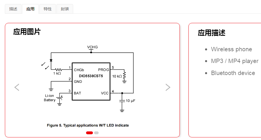 The DIO5538CST5 is a complete constant-current / constant voltage linear charger for single cell Lithium-Ion batteries. No external sense resistor is needed, and no blocking diode is required due to the internal MOSFET architecture. Thermal feedback regulates the charge current to limit the die temperature during high power operation or high ambient temperature. The charge voltage is fixed at 4.35 V for DIO5538CST5, and the charge current can be programmed externally with a single resistor. The DIO5538CST5 automatically terminates the charge cycle when the charge current drops to 1/10 the programmed value after the final float voltage is reached. When the input supply (wall adapter or USB supply) is removed, the DIO5538CST5 automatically enters a low current state, dropping the battery drain current to less than 0.5 µA. The DIO5538CST5 can be put into shutdown mode, reducing supply current to 40 µA (Typ.). The DIO5538CST5 is available in a small package with SOT23-5. Standard product is Pb-Free.
